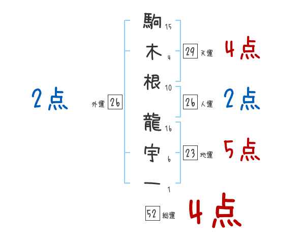 天運![]() | 駒木根龍宇一さんの天運は29画の4つ星!完全主義で才能がある。厳格な心の持ち主。 家系が持つ宿命的な運勢を表します。祖先から受け継いだ苗字ですので自分の力が及びません。家柄を象徴します。 |