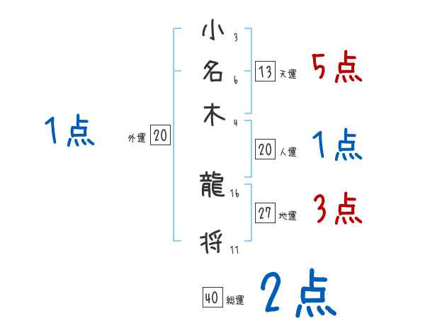 総運![]() | 小名木龍将さんの総運は40画の2つ星!自信過剰で物事に固執するためトラブルに注意。 あなたの人生を表す1番重要な運勢です。生涯を通じて影響する総合運となり、主に50歳以降の晩年期に影響を及ぼします。 |