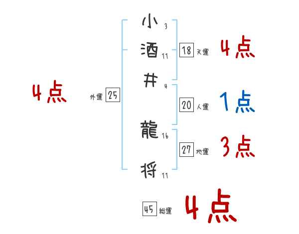 天運![]() | 小酒井龍将さんの天運は18画の4つ星!情熱的で剛気。忍耐力があり信頼される。 家系が持つ宿命的な運勢を表します。祖先から受け継いだ苗字ですので自分の力が及びません。家柄を象徴します。 |