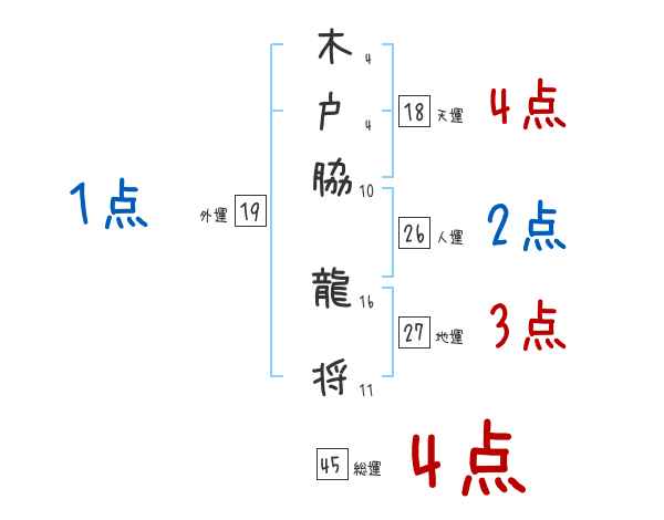 天運![]() | 木戸脇龍将さんの天運は18画の4つ星!情熱的で剛気。忍耐力があり信頼される。 家系が持つ宿命的な運勢を表します。祖先から受け継いだ苗字ですので自分の力が及びません。家柄を象徴します。 |