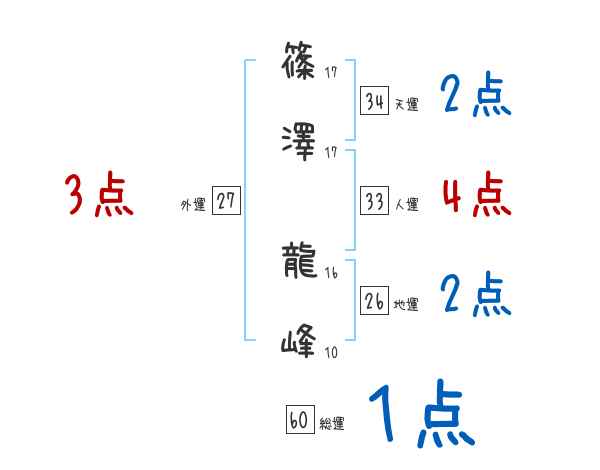 総運![]() | 篠澤龍峰さんの総運は60画の1つ星!悲観的で迷いやすい。波乱が多く損をしないように。 あなたの人生を表す1番重要な運勢です。生涯を通じて影響する総合運となり、主に50歳以降の晩年期に影響を及ぼします。 |