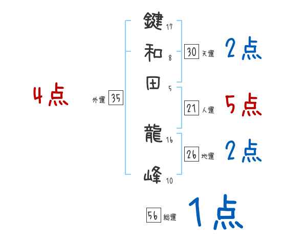 外運![]() | 鍵和田龍峰さんの外運は35画の4つ星!温厚な性格で感受性が高い。穏和な性格で人望が厚い。 生活面を象徴する運勢です。外部から受ける影響力を表し、結婚運、家庭運や職場、環境への順応性を表します。 |