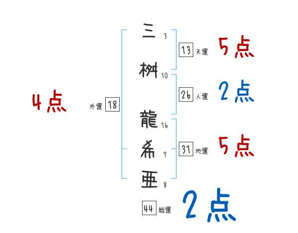 総運![]() | 三桝龍希亜さんの総運は44画の2つ星!誠実で慎重な性格。物事を考えすぎないように注意しましょう。 あなたの人生を表す1番重要な運勢です。生涯を通じて影響する総合運となり、主に50歳以降の晩年期に影響を及ぼします。 |