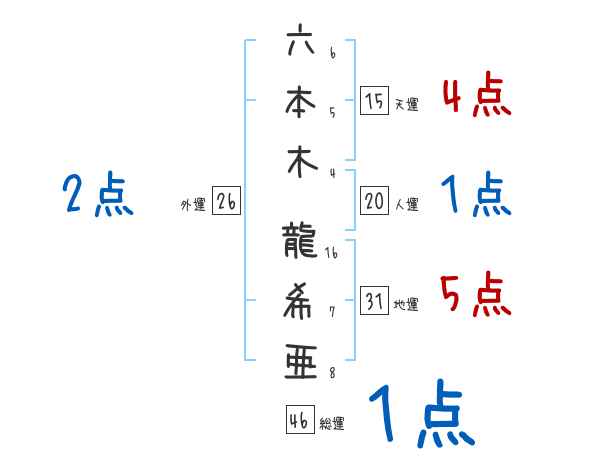 外運![]() | 六本木龍希亜さんの外運は26画の2つ星!波瀾万丈かも。信頼できる人を大事にしましょう。 生活面を象徴する運勢です。外部から受ける影響力を表し、結婚運、家庭運や職場、環境への順応性を表します。 |