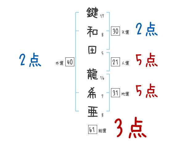 天運![]() | 鍵和田龍希亜さんの天運は30画の2つ星!浮き沈みの激しさに注意しましょう。 家系が持つ宿命的な運勢を表します。祖先から受け継いだ苗字ですので自分の力が及びません。家柄を象徴します。 |
