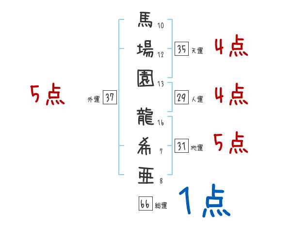 天運![]() | 馬場園龍希亜さんの天運は35画の4つ星!温厚な性格で感受性が高い。穏和な性格で人望が厚い。 家系が持つ宿命的な運勢を表します。祖先から受け継いだ苗字ですので自分の力が及びません。家柄を象徴します。 |