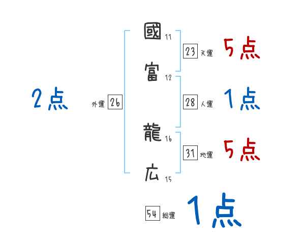 天運![]() | 國富龍広さんの天運は23画の5つ星!想像力に優れ活力がある。一代で成功し名誉を手に入れる。 家系が持つ宿命的な運勢を表します。祖先から受け継いだ苗字ですので自分の力が及びません。家柄を象徴します。 |