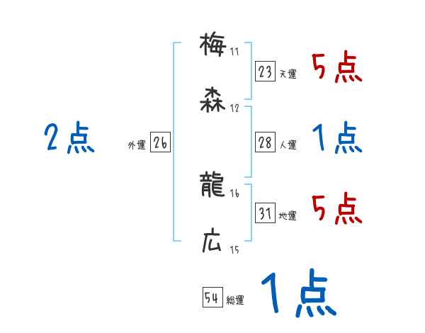 総運![]() | 梅森龍広さんの総運は54画の1つ星!トラブルが多いかも。周りをよく見て協調して過ごしましょう。 あなたの人生を表す1番重要な運勢です。生涯を通じて影響する総合運となり、主に50歳以降の晩年期に影響を及ぼします。 |