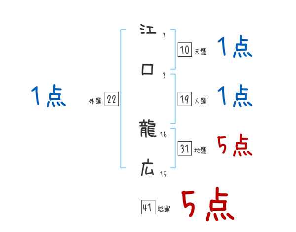 天運![]() | 江口龍広さんの天運は10画の1つ星!不安を感じやすい傾向。ストレスを抱えないように注意しましょう。 家系が持つ宿命的な運勢を表します。祖先から受け継いだ苗字ですので自分の力が及びません。家柄を象徴します。 |