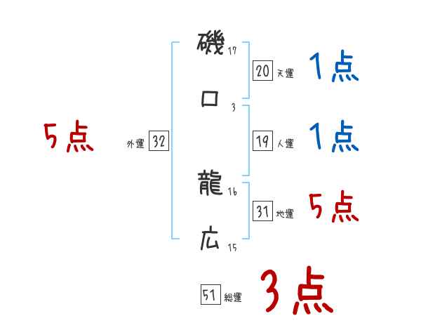 外運![]() | 磯口龍広さんの外運は32画の5つ星!柔軟性があり成功する。チャンスが多く金運が良い。 生活面を象徴する運勢です。外部から受ける影響力を表し、結婚運、家庭運や職場、環境への順応性を表します。 |