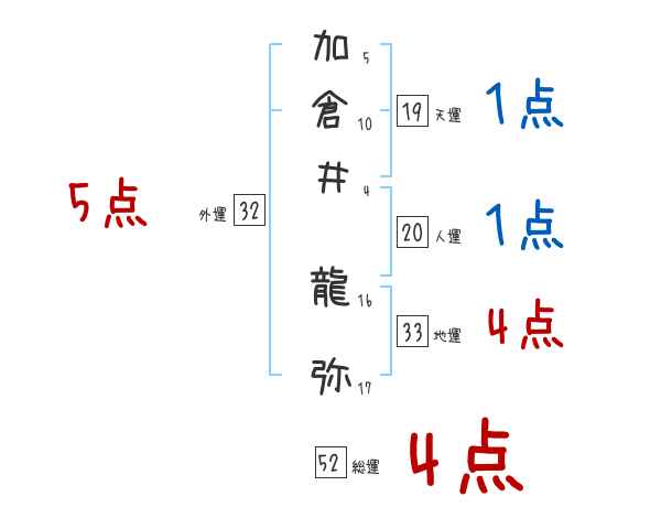 外運![]() | 加倉井龍弥さんの外運は32画の5つ星!柔軟性があり成功する。チャンスが多く金運が良い。 生活面を象徴する運勢です。外部から受ける影響力を表し、結婚運、家庭運や職場、環境への順応性を表します。 |