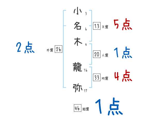 総運![]() | 小名木龍弥さんの総運は46画の1つ星!迷走することが多く苦労するかも。目先のことにとらわれないように。 あなたの人生を表す1番重要な運勢です。生涯を通じて影響する総合運となり、主に50歳以降の晩年期に影響を及ぼします。 |
