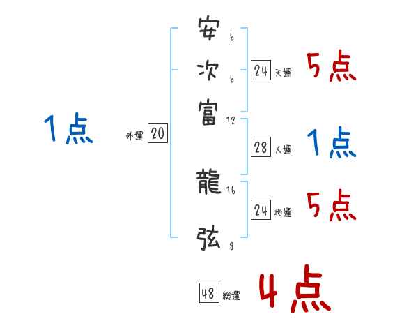 天運![]() | 安次富龍弦さんの天運は24画の5つ星!家庭運が良く順調な人生。金運にも恵まれる。 家系が持つ宿命的な運勢を表します。祖先から受け継いだ苗字ですので自分の力が及びません。家柄を象徴します。 |