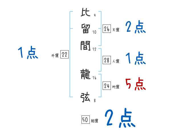 天運![]() | 比留間龍弦さんの天運は26画の2つ星!波瀾万丈かも。信頼できる人を大事にしましょう。 家系が持つ宿命的な運勢を表します。祖先から受け継いだ苗字ですので自分の力が及びません。家柄を象徴します。 |