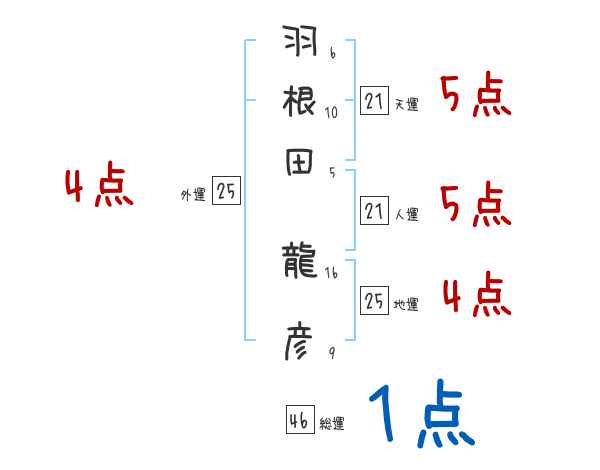 天運![]() | 羽根田龍彦さんの天運は21画の5つ星!統率力がある。独立し成功する。名誉を手に入れる。 家系が持つ宿命的な運勢を表します。祖先から受け継いだ苗字ですので自分の力が及びません。家柄を象徴します。 |
