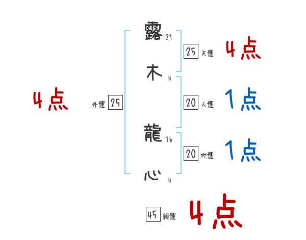 天運![]() | 露木龍心さんの天運は25画の4つ星!個性があり才能があふれる。強運の持ち主で発展する。 家系が持つ宿命的な運勢を表します。祖先から受け継いだ苗字ですので自分の力が及びません。家柄を象徴します。 |