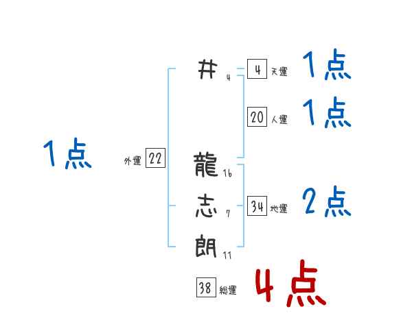 天運![]() | 井龍志朗さんの天運は4画の1つ星!感情が不安定で苦労するかも。周囲との協調を心掛けましょう。 家系が持つ宿命的な運勢を表します。祖先から受け継いだ苗字ですので自分の力が及びません。家柄を象徴します。 |