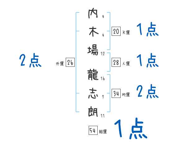 外運![]() | 内木場龍志朗さんの外運は26画の2つ星!波瀾万丈かも。信頼できる人を大事にしましょう。 生活面を象徴する運勢です。外部から受ける影響力を表し、結婚運、家庭運や職場、環境への順応性を表します。 |