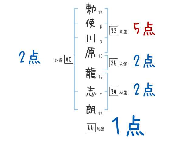 天運![]() | 勅使川原龍志朗さんの天運は32画の5つ星!柔軟性があり成功する。チャンスが多く金運が良い。 家系が持つ宿命的な運勢を表します。祖先から受け継いだ苗字ですので自分の力が及びません。家柄を象徴します。 |