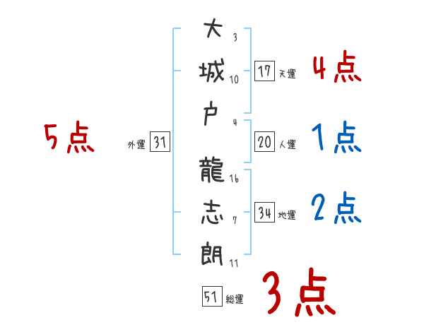 総運![]() | 大城戸龍志朗さんの総運は51画の3つ星!変化が激しく、危険に注意。堅実な性格。 あなたの人生を表す1番重要な運勢です。生涯を通じて影響する総合運となり、主に50歳以降の晩年期に影響を及ぼします。 |