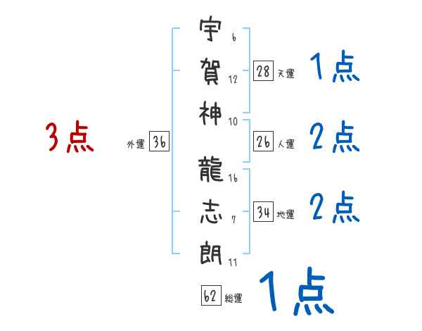 天運![]() | 宇賀神龍志朗さんの天運は28画の1つ星!家庭環境に注意。スポーツで活躍できる能力があるかも。 家系が持つ宿命的な運勢を表します。祖先から受け継いだ苗字ですので自分の力が及びません。家柄を象徴します。 |