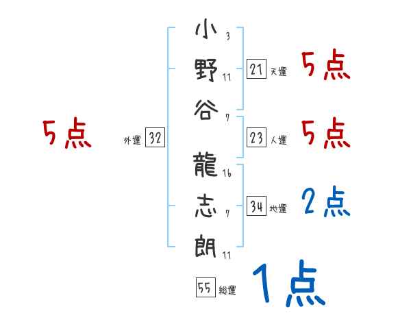 外運![]() | 小野谷龍志朗さんの外運は32画の5つ星!柔軟性があり成功する。チャンスが多く金運が良い。 生活面を象徴する運勢です。外部から受ける影響力を表し、結婚運、家庭運や職場、環境への順応性を表します。 |