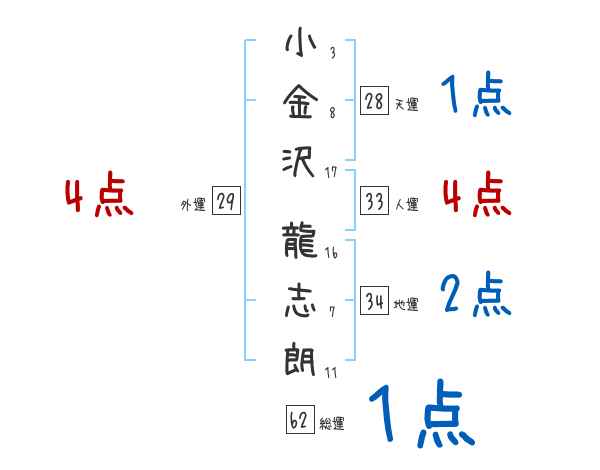 外運![]() | 小金沢龍志朗さんの外運は29画の4つ星!完全主義で才能がある。厳格な心の持ち主。 生活面を象徴する運勢です。外部から受ける影響力を表し、結婚運、家庭運や職場、環境への順応性を表します。 |