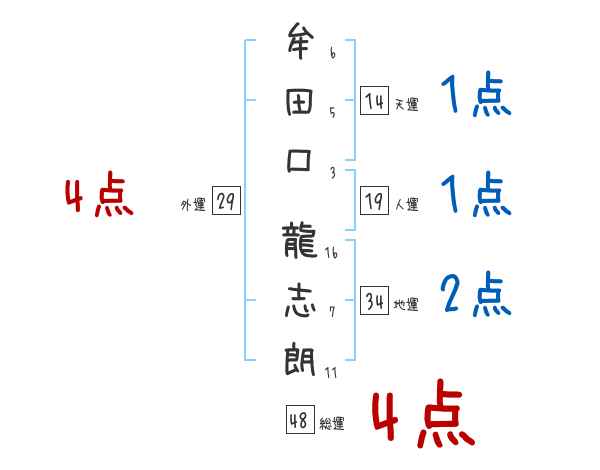 総運![]() | 牟田口龍志朗さんの総運は48画の4つ星!賢明な性格で人望が厚い。指導力があり多くの人に尊敬される。 あなたの人生を表す1番重要な運勢です。生涯を通じて影響する総合運となり、主に50歳以降の晩年期に影響を及ぼします。 |