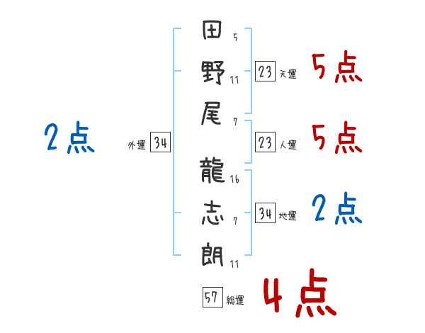 総運![]() | 田野尾龍志朗さんの総運は57画の4つ星!向上心があり人望がある。地位を得る。 あなたの人生を表す1番重要な運勢です。生涯を通じて影響する総合運となり、主に50歳以降の晩年期に影響を及ぼします。 |