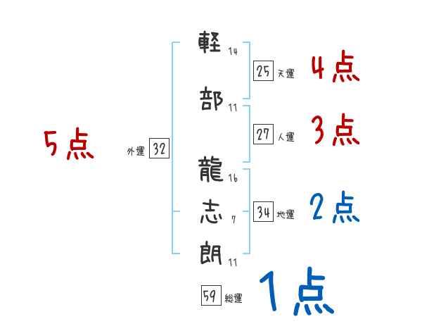 外運![]() | 軽部龍志朗さんの外運は32画の5つ星!柔軟性があり成功する。チャンスが多く金運が良い。 生活面を象徴する運勢です。外部から受ける影響力を表し、結婚運、家庭運や職場、環境への順応性を表します。 |