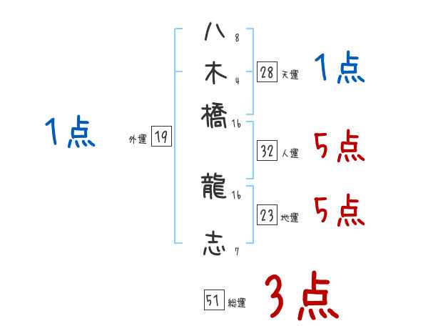 人運![]() | 八木橋龍志さんの人運は32画の5つ星!柔軟性があり成功する。チャンスが多く金運が良い。 性格や才能などを表す2番目に重要な運勢です。人間関係や協調性、社会的な成功に影響します。主に20歳から50歳ぐらいまでの中年期の運勢を表します。 |