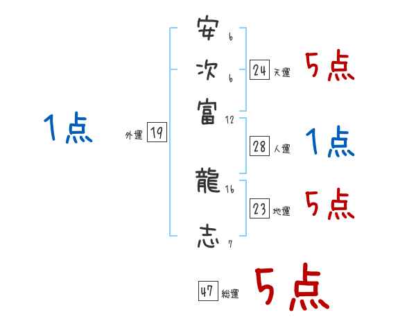 天運![]() | 安次富龍志さんの天運は24画の5つ星!家庭運が良く順調な人生。金運にも恵まれる。 家系が持つ宿命的な運勢を表します。祖先から受け継いだ苗字ですので自分の力が及びません。家柄を象徴します。 |
