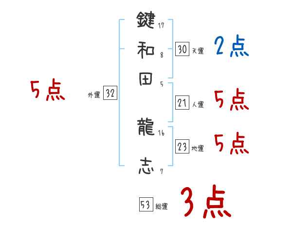 外運![]() | 鍵和田龍志さんの外運は32画の5つ星!柔軟性があり成功する。チャンスが多く金運が良い。 生活面を象徴する運勢です。外部から受ける影響力を表し、結婚運、家庭運や職場、環境への順応性を表します。 |
