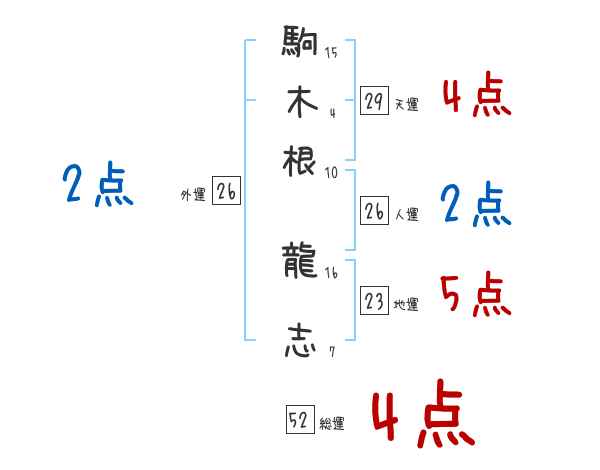 天運![]() | 駒木根龍志さんの天運は29画の4つ星!完全主義で才能がある。厳格な心の持ち主。 家系が持つ宿命的な運勢を表します。祖先から受け継いだ苗字ですので自分の力が及びません。家柄を象徴します。 |