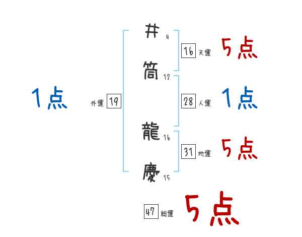 外運![]() | 井筒龍慶さんの外運は19画の1つ星!優れた才能を持ちますが、協調性が足りないことも。周りの人と協力する事を意識しましょう。 生活面を象徴する運勢です。外部から受ける影響力を表し、結婚運、家庭運や職場、環境への順応性を表します。 |