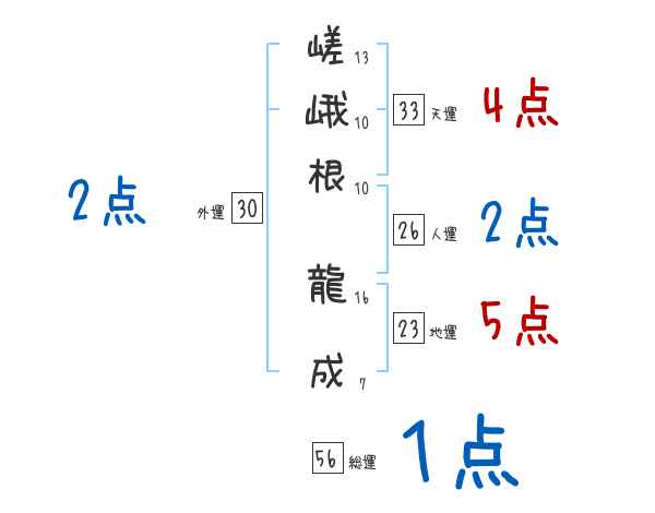 天運![]() | 嵯峨根龍成さんの天運は33画の4つ星!権力志向でプライドが高い。勇気があり運を切り開き成功する。 家系が持つ宿命的な運勢を表します。祖先から受け継いだ苗字ですので自分の力が及びません。家柄を象徴します。 |