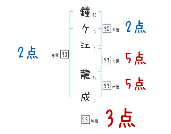 人運![]() | 鐘ケ江龍成さんの人運は23画の5つ星!想像力に優れ活力がある。一代で成功し名誉を手に入れる。 性格や才能などを表す2番目に重要な運勢です。人間関係や協調性、社会的な成功に影響します。主に20歳から50歳ぐらいまでの中年期の運勢を表します。 |