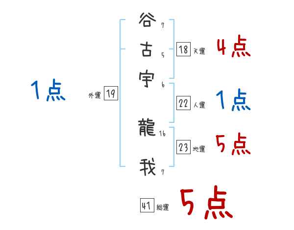 天運![]() | 谷古宇龍我さんの天運は18画の4つ星!情熱的で剛気。忍耐力があり信頼される。 家系が持つ宿命的な運勢を表します。祖先から受け継いだ苗字ですので自分の力が及びません。家柄を象徴します。 |