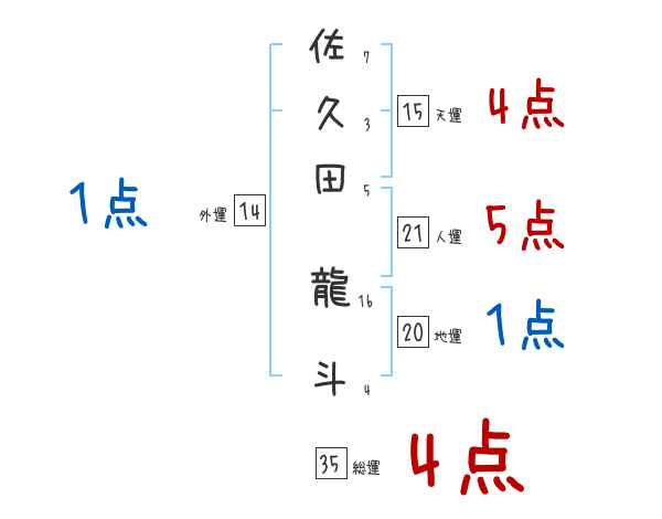 | 総運  | 佐久田龍斗さんの総運は35画の4つ星!温厚な性格で感受性が高い。穏和な性格で人望が厚い。あなたの人生を表す1番重要な運勢です。生涯を通じて影響する総合運となり、主に50歳以降の晩年期に影響を及ぼします。 |