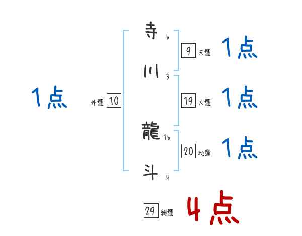 総運![]() | 寺川龍斗さんの総運は29画の4つ星!完全主義で才能がある。厳格な心の持ち主。 あなたの人生を表す1番重要な運勢です。生涯を通じて影響する総合運となり、主に50歳以降の晩年期に影響を及ぼします。 |