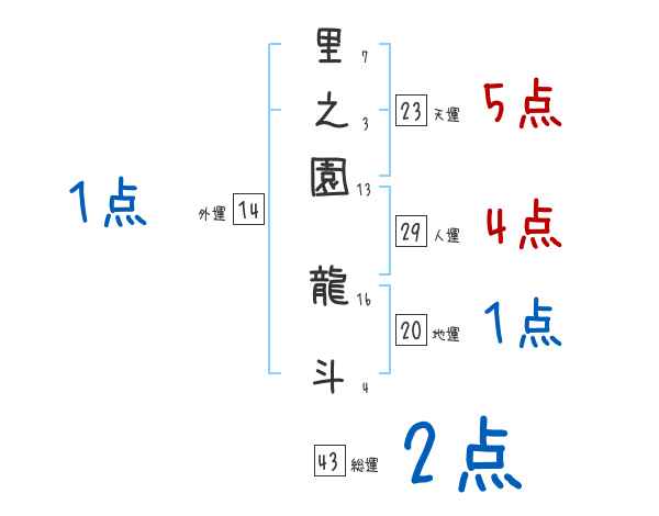 外運![]() | 里之園龍斗さんの外運は14画の1つ星!人に対して優しいがストレスを溜め込みがち。人間関係のトラブルを避けるよう気をつけましょう。 生活面を象徴する運勢です。外部から受ける影響力を表し、結婚運、家庭運や職場、環境への順応性を表します。 |