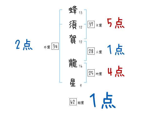 総運![]() | 蜂須賀龍星さんの総運は62画の1つ星!困難なトラブルが多く精神的に疲労しないように気をつけましょう。 あなたの人生を表す1番重要な運勢です。生涯を通じて影響する総合運となり、主に50歳以降の晩年期に影響を及ぼします。 |