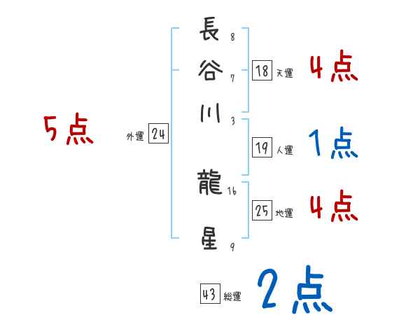 天運![]() | 長谷川龍星さんの天運は18画の4つ星!情熱的で剛気。忍耐力があり信頼される。 家系が持つ宿命的な運勢を表します。祖先から受け継いだ苗字ですので自分の力が及びません。家柄を象徴します。 |