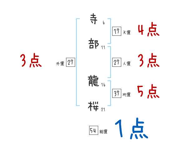 地運![]() | 寺部龍桜さんの地運は37画の5つ星!努力家で順応性に優れる。現実的な考え方ができ忠実に物事をこなす。 個性を表す基礎的な運勢です。性格形成や対人関係、行動力など家庭環境に影響されます。主に誕生してから20歳くらいまでの若年期の運勢を表します。 |