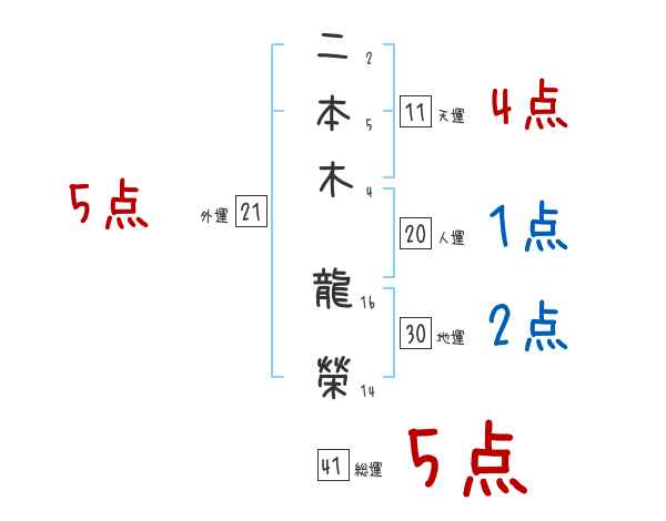 外運![]() | 二本木龍榮さんの外運は21画の5つ星!統率力がある。独立し成功する。名誉を手に入れる。 生活面を象徴する運勢です。外部から受ける影響力を表し、結婚運、家庭運や職場、環境への順応性を表します。 |