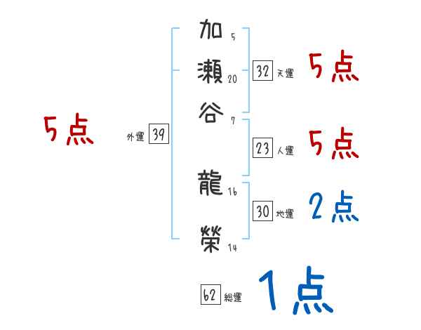 天運![]() | 加瀬谷龍榮さんの天運は32画の5つ星!柔軟性があり成功する。チャンスが多く金運が良い。 家系が持つ宿命的な運勢を表します。祖先から受け継いだ苗字ですので自分の力が及びません。家柄を象徴します。 |