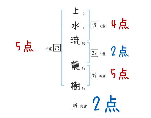 天運![]() | 上水流龍樹さんの天運は17画の4つ星!積極的な行動力。地位を気づき財産を手に入れる。純粋な心と直感力。 家系が持つ宿命的な運勢を表します。祖先から受け継いだ苗字ですので自分の力が及びません。家柄を象徴します。 |