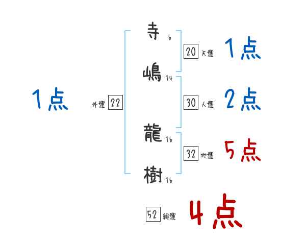 外運![]() | 寺嶋龍樹さんの外運は22画の1つ星!努力することが苦手ないっぽう手先が器用。芸術性にも優れる。 生活面を象徴する運勢です。外部から受ける影響力を表し、結婚運、家庭運や職場、環境への順応性を表します。 |