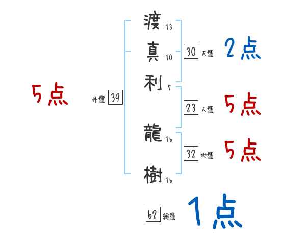 外運![]() | 渡真利龍樹さんの外運は39画の5つ星!社交性に優れ人望が厚い。人の上に立ち成功する。 生活面を象徴する運勢です。外部から受ける影響力を表し、結婚運、家庭運や職場、環境への順応性を表します。 |