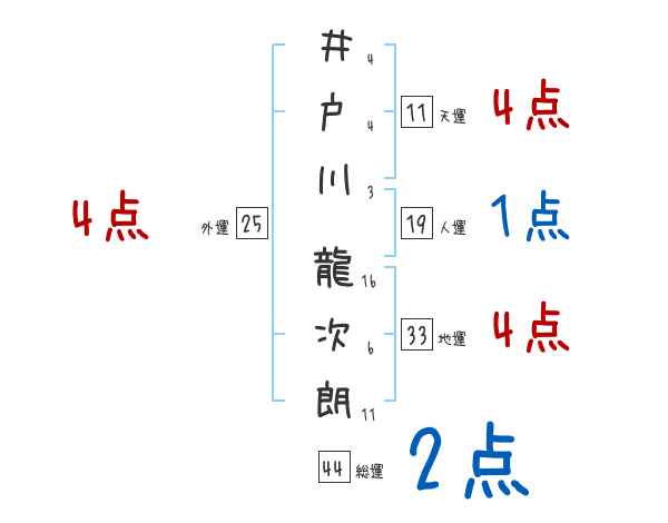 総運![]() | 井戸川龍次朗さんの総運は44画の2つ星!誠実で慎重な性格。物事を考えすぎないように注意しましょう。 あなたの人生を表す1番重要な運勢です。生涯を通じて影響する総合運となり、主に50歳以降の晩年期に影響を及ぼします。 |